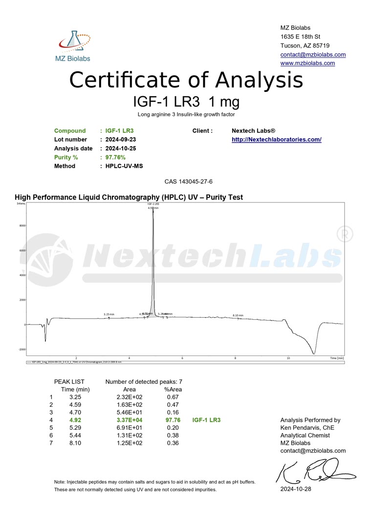 Nextech Laboratories offers IGF-LR3, a premium-grade IGF 1 peptide designed exclusively for research applications. This 1mg vial contains a highly purified form of Insulin-like Growth Factor 1 Long Arg3 (IGF-1 LR3), known for its increased biological activity and extended half-life compared to standard IGF-1.